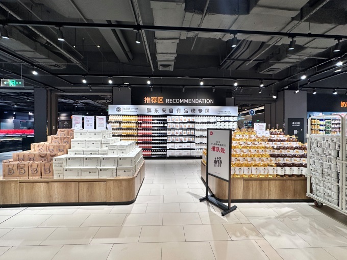 令人驚喜的是,超市引入胖東來自有品牌專區(qū),DL果蔬餐具凈、DL洗衣凝珠、DL寶豐自由愛白酒、DL水果燕麥脆、DL100%果蔬汁、DL壓榨一級花生油等商品集中陳列,讓濱海市民在家門口就可以買到胖東來品質(zhì)好物。