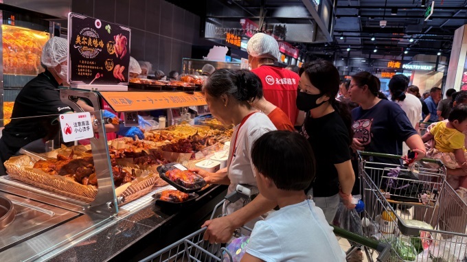 煙火廚房革命,甜腸、麻辣牛肉條等胖東來(lái)同款熱食即選即享,小龍蝦抱抱桶、蒜泥生蠔、撈汁小海鮮等成夜宵爆款;烘焙區(qū)以榴蓮千層、豐收的喜悅、提拉米蘇等爆款單品突圍,鮮食品類占比從 6% 躍升至 13%,現(xiàn)制美食香氣彌漫整個(gè)賣場(chǎng)。