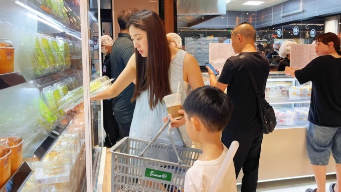 烘焙熟食專區(qū)成焦點(diǎn),煙火氣升級。烘焙及熟食占比從6.4%提升至10.6%,營業(yè)面積增至342㎡,新引入220款現(xiàn)制現(xiàn)售品,其中麻辣小龍蝦、鍋包肉、熱鹵甜腸、榴蓮酥、烤雞翅等熱銷單品尤為火爆。 消費(fèi)者陳女士分享:“超市熟食現(xiàn)做現(xiàn)賣,透明檔口看著安心,味道還特別好,家人吃得放心,性價比比外賣高多了。