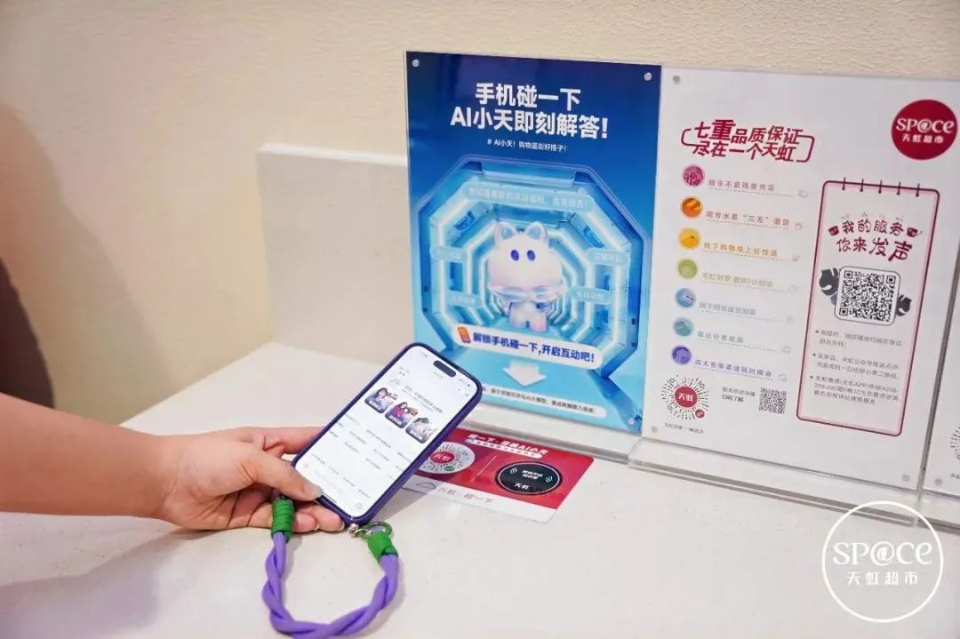離場(chǎng)前,再次用手機(jī)碰一碰nfc線圈標(biāo)識(shí),停車?yán)U費(fèi)、積分兌換等事務(wù)輕松搞定。從入場(chǎng)、選購到離場(chǎng),AI小天智能體在場(chǎng)內(nèi)陪伴顧客的消費(fèi)決策,是顧客逛超市的智能“搭子”。