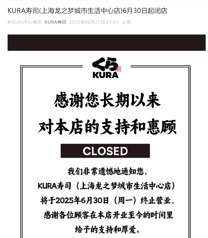 另據(jù)KURA壽司官方公眾號(hào)6月22日發(fā)文確認(rèn),其大陸首店上海龍之夢(mèng)店也將于6月30日(今日)終止?fàn)I業(yè)。