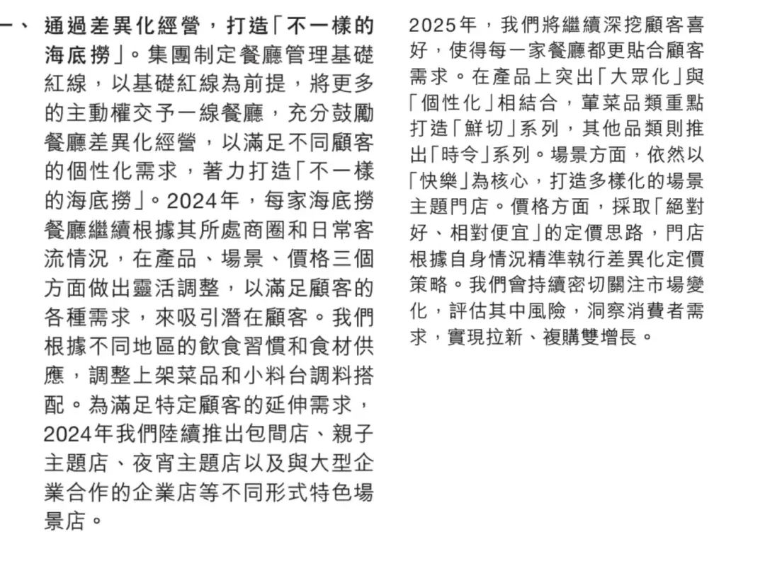 海底撈早在2024年的年報(bào)中便強(qiáng)調(diào),通過(guò)差異化的運(yùn)營(yíng),打造“不一樣的海底撈”。2024年就陸續(xù)推出了包間店、親子主題店、夜宵主題店,以及大型企業(yè)合作的企業(yè)店等。