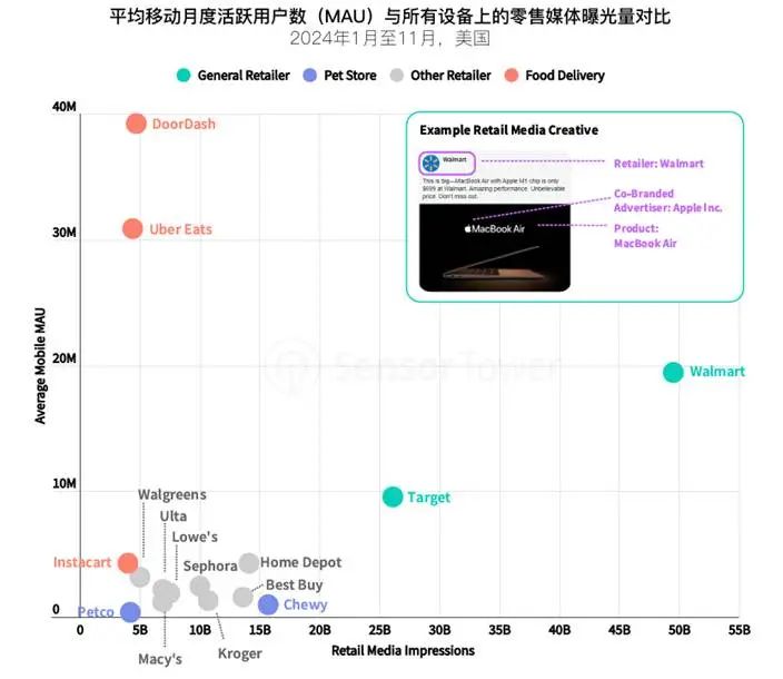 圖:美國(guó)零售類APP月活和曝光率坐標(biāo)圖,來(lái)源:Sensor Tower