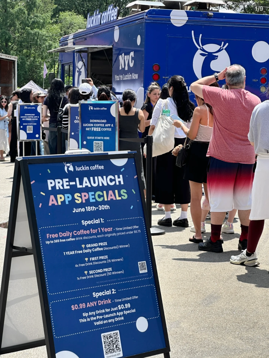 為預熱開業(yè),瑞幸美國團隊近期在紐約聯合廣場、SOHO區(qū)等人流密集商圈開展了快閃車(Pop-up Truck)推廣活動。活動推出“一年免費喝咖啡”等重磅優(yōu)惠,吸引了大量當地消費者排隊參與,相關場景在社交平臺引發(fā)網友們關注。