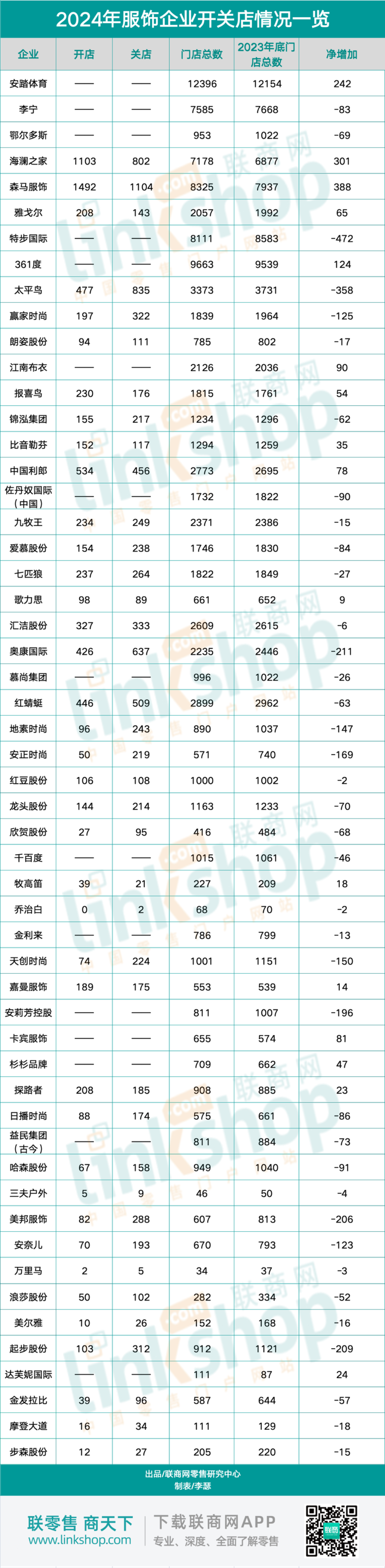 截至2024年底,54家上市公司擁有門店總數(shù)為105403家,而2023年年底該數(shù)字為107334家,這意味著2024年54家服飾上市公司門店數(shù)量凈減少1931家。