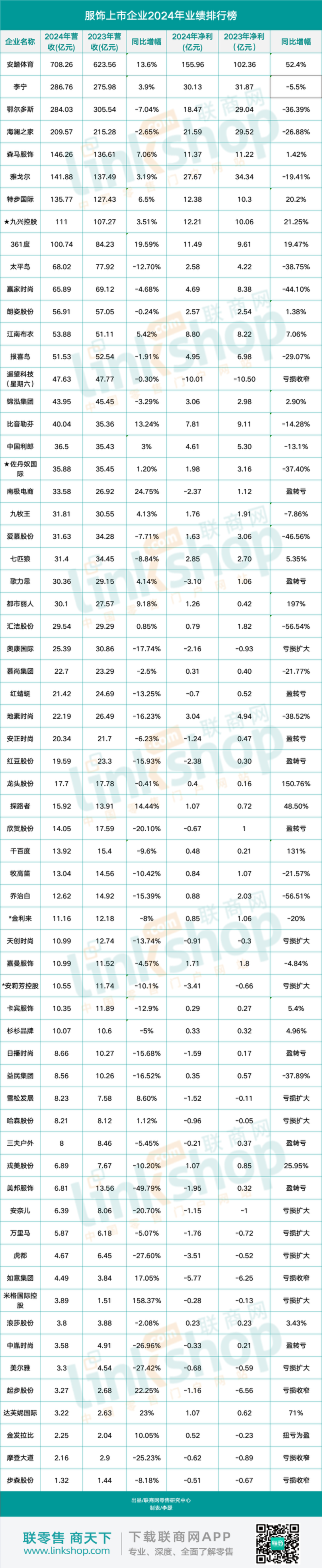 附:2024年服飾上市企業(yè)業(yè)績排行榜