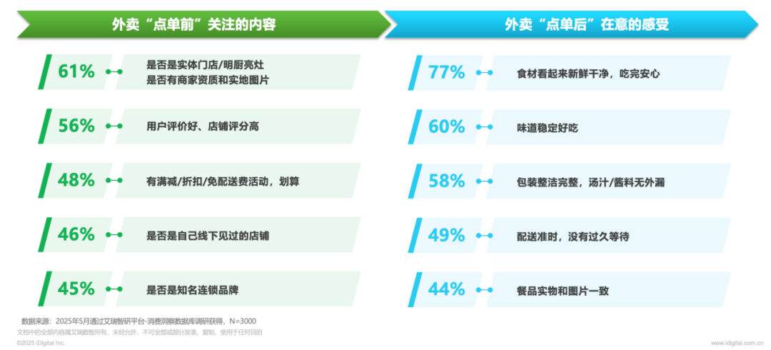 據(jù)艾瑞咨詢,消費(fèi)者在點(diǎn)外賣前,有61%的人會關(guān)注商家是否為實(shí)體門店和明廚亮灶,是否有商家資質(zhì)和實(shí)地圖片。下單后,有77%的消費(fèi)者會在意食材的新鮮程度和安全性。這足以說明,隨著社會消費(fèi)的發(fā)展升級,消費(fèi)者越來越關(guān)注餐飲外賣的品質(zhì)問題。