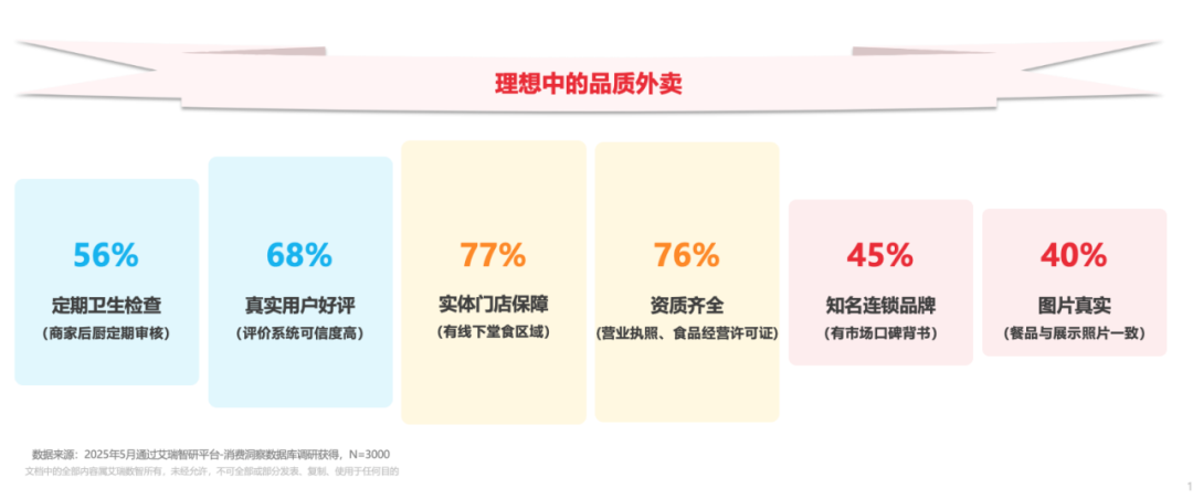 這完美契合了消費(fèi)者對品質(zhì)外賣的關(guān)鍵需求。據(jù)艾瑞咨詢,消費(fèi)者將“擁有實(shí)體門店”列為品質(zhì)外賣的首要標(biāo)準(zhǔn),其次是資質(zhì)齊全。