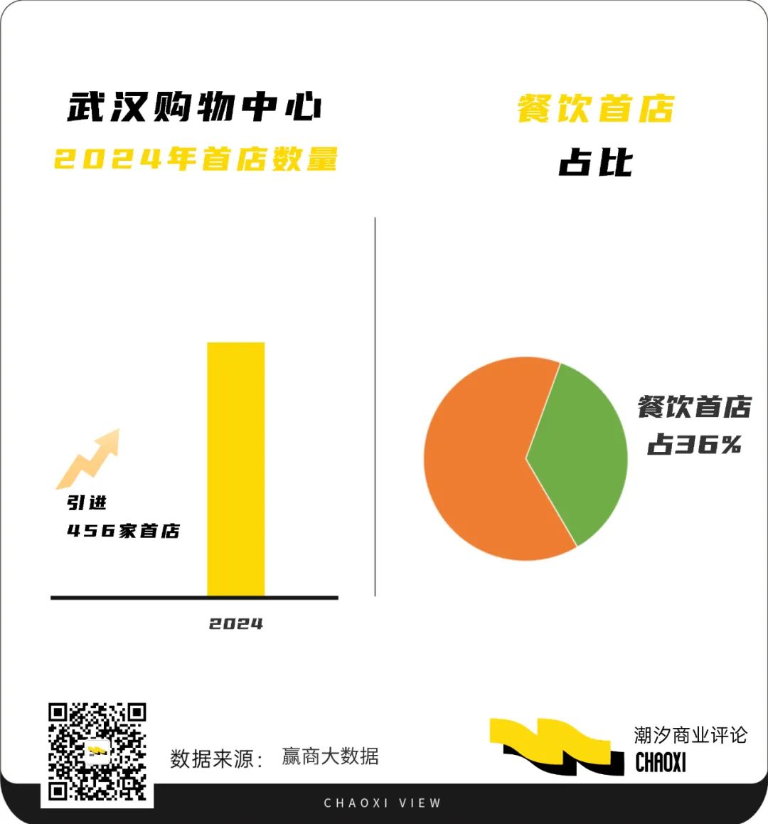 這首先與武漢近年來(lái)的商業(yè)地產(chǎn)爆發(fā)密切相關(guān)。僅2024年,SKP與萬(wàn)象城兩大高端商業(yè)體相繼落地江城,18個(gè)標(biāo)桿項(xiàng)目也隨之開業(yè)。在新玩家入局的同時(shí),武商MALL、武漢天地等老牌商業(yè)地產(chǎn),也在通過(guò)積極的創(chuàng)新舉措進(jìn)行品牌升級(jí)與煥新。這些地標(biāo)性商業(yè)地產(chǎn)不僅自帶黃金鋪位、高端奢牌和頂級(jí)客流,也有無(wú)形的品牌背書。據(jù)贏商大數(shù)據(jù),武漢購(gòu)物中心僅在2024年就引進(jìn)了456家首店,其中36%都是餐飲首店。