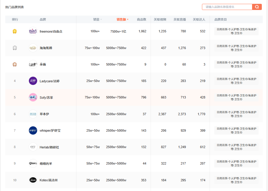 短短3個多月,這個新銳衛(wèi)生巾品牌發(fā)展態(tài)勢驚人地迅猛。據(jù)用戶說進一步挖掘,618大促期間,朵薇品牌也以黑馬之姿上榜抖音衛(wèi)生巾品牌TOP3,趕超蘇菲、護舒寶、高潔絲、七度空間等傳統(tǒng)頭部衛(wèi)生巾品牌,以僅9款商品鏈接,撬動了5000w~7500w銷售額、100w+銷量,僅次于自由點、淘淘氧棉。