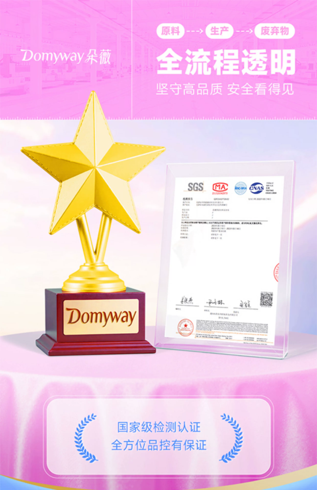 其次是全面公開透明的產品安全生產與權威認證背書。朵薇對外宣傳表明,其在從原料到生產到廢棄物等環(huán)節(jié)打造“全透明工廠”,產品包裝附帶的溯源二維碼,支持消費者隨時溯源、監(jiān)督與反饋產品問題,并同步展示其產品已獲得的醫(yī)護級產品17項指標系列權威認證、CMA(致敏相關)專業(yè)認證等,進一步提高用戶好感度與信任感。從當前的市場銷售數(shù)據(jù)來看,朵薇無疑取得了初步成功。