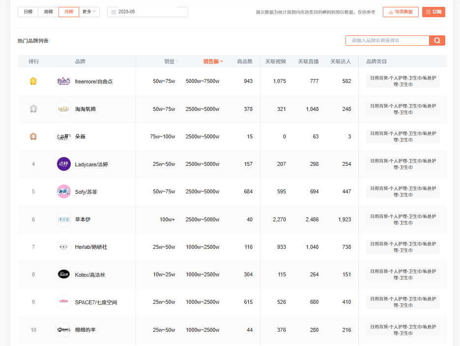 截至2025年6月底,這場為衛(wèi)生巾新老品牌攻防戰(zhàn)爭中,傳統(tǒng)品牌算守住了市場擂臺。抖音6月份銷售數(shù)據(jù)顯示,自由點、淘淘氧棉持續(xù)霸榜第一、二位,潔婷、蘇菲、她研社、高潔絲、七度空間等領先品牌持續(xù)上榜并共計占領了70%的份額。