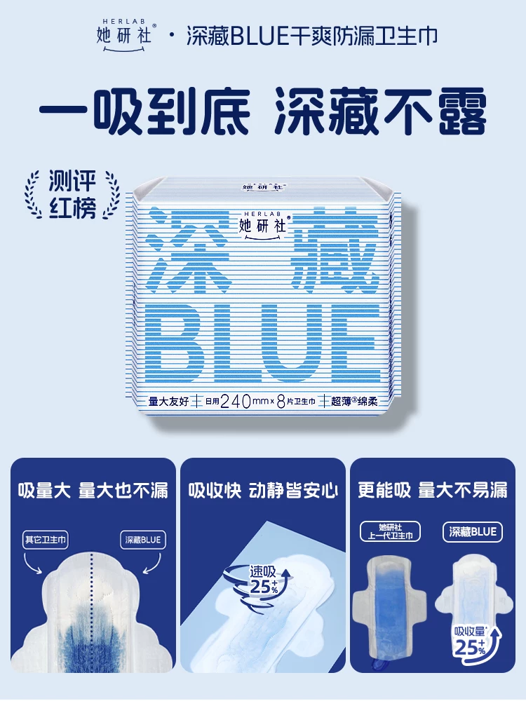 此外,蘇菲借助與老爸評測合作重塑用戶信任;七度空間提出“女性經期健康科學7重標準”,并聯(lián)合春雨醫(yī)生發(fā)布《中國女性經期私處健康白皮書——我身體里的紅色微生態(tài)》,強調科學防護、女性私處微生態(tài)平衡,以及從產品功能到情感陪伴全面升級;她研社上新“深藏BLUE輕透款”衛(wèi)生巾,聚焦產品吸收能力與透氣、干爽性能大幅提升等,紛紛在產品、營銷維度重構品牌專業(yè)、安全屬性。