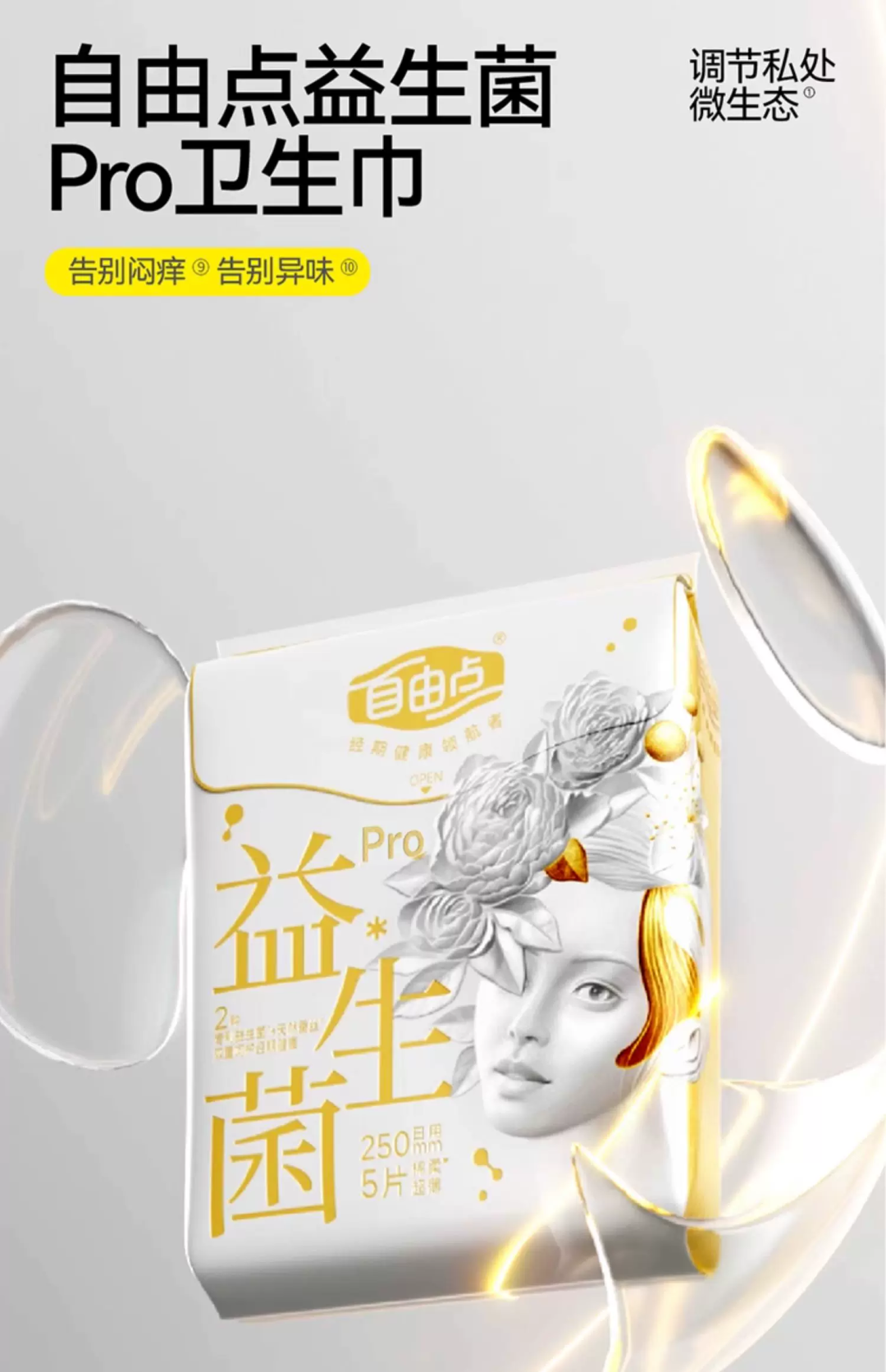 進一步挖掘傳統(tǒng)品牌的份額堅守要素,也離不開其在產品、營銷上重塑或強化品牌專業(yè)、安全、女性友好形象。例如自由點在產品上,推出自由點益生菌Pro衛(wèi)生巾,同樣以“醫(yī)護級”為核心賣點,且根據(jù)其與上海市計生所醫(yī)院聯(lián)合開展的“含滅活益生菌的衛(wèi)生巾對陰道菌群的調節(jié)作用”臨床試驗結論,自由點首次將婦科微生物組學研究引入衛(wèi)生巾研發(fā)領域,該產品對特定類型陰道微生態(tài)具有一定調節(jié)效果。