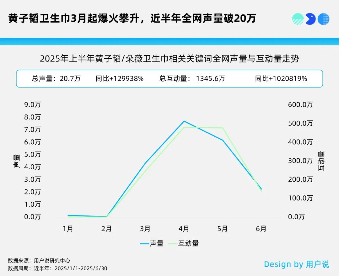提到年初至今的美妝個護行業(yè)熱點話題,“黃子韜朵薇衛(wèi)生巾”不遑多讓。用戶說數(shù)據(jù)顯示,3月份起相關話題爆火攀升,截至6月底全網聲量突破20萬,總互動量1345.6萬,同比增速分別高達129938%、1020819%!
