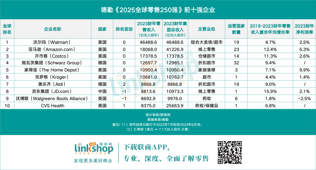 此外,德國“折扣雙雄”表現(xiàn)尤為亮眼:施瓦茨集團(Lidl母公司)穩(wěn)居第四位,奧樂齊(Aldi)營收躍升至第七位,較上年提升兩個名次。中國的京東集團位列第八,排名較上年下滑一位。美國連鎖藥店CVS以9.5%的增速領(lǐng)跑增長榜,其創(chuàng)新的“醫(yī)療+零售”融合模式成效顯著。