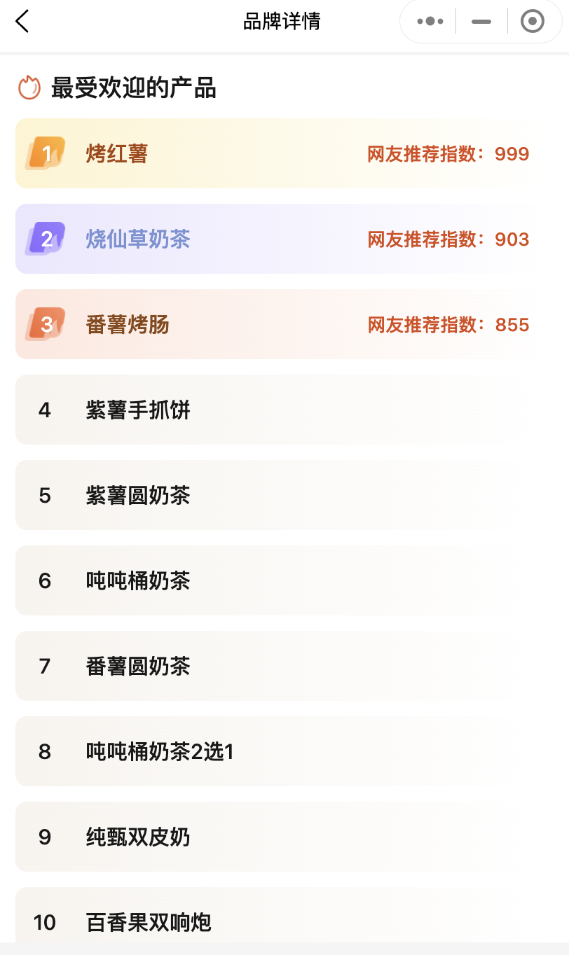 快樂番薯:全國門店數(shù)2033家,福建門店占比超44%,依托“烤紅薯”、“燒仙草”等小吃化產(chǎn)品深入二、三線城市及縣域市場。