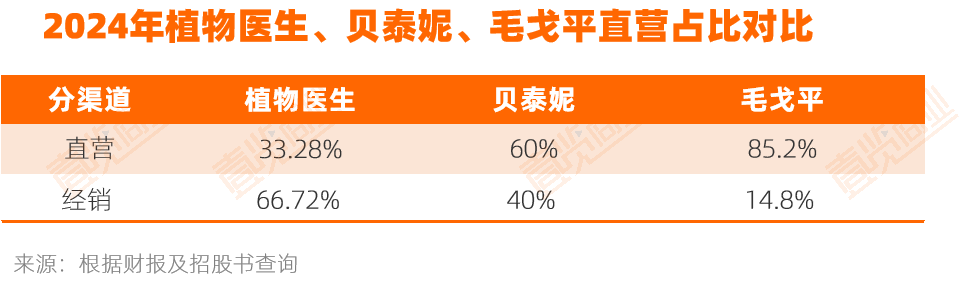 值得注意的是,植物醫(yī)生的線下渠道銷售和高比例的經(jīng)銷模式對其綜合毛利率的增長起到了反作用。2024年,經(jīng)銷模式的毛利率是51.81%,直營模式的毛利率是71.16%.。植物醫(yī)生對此也稱:“由于經(jīng)銷模式下,公司需為經(jīng)銷商留有一定的利潤空間,因此毛利率低于直營模式!
