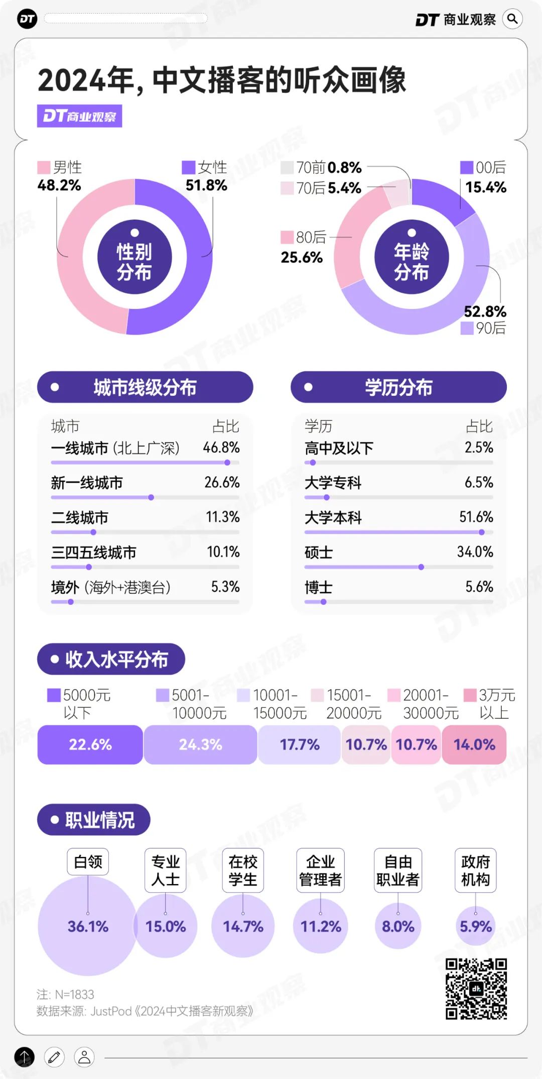 根據(jù)Just Pod發(fā)布的《2024中文播客新觀察》,播客的聽眾普遍年輕,90后、00后占比近7成,他們往往接受過良好教育(一線及新一線城市的人群占比超70%,大學(xué)本科及以上的人均占比超9成)、整體收入水平較高。