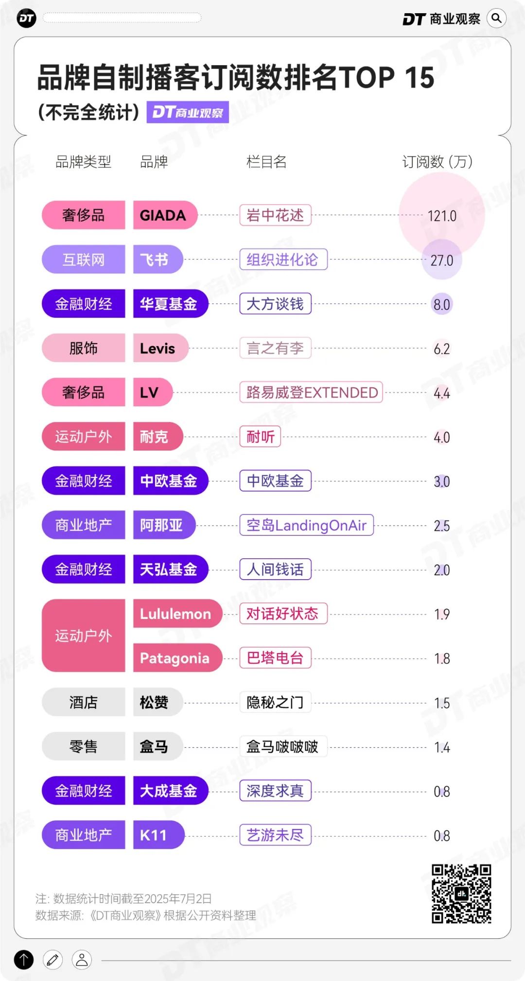 我們可以發(fā)現(xiàn),自制播客的品牌,往往已經(jīng)位居行業(yè)頭部,或者是“講調(diào)性”“講故事”的品牌/行業(yè),比如奢侈品、新消費(fèi)品牌,這些品牌在流量、轉(zhuǎn)化之外,還很在意“品牌理念”的傳遞。