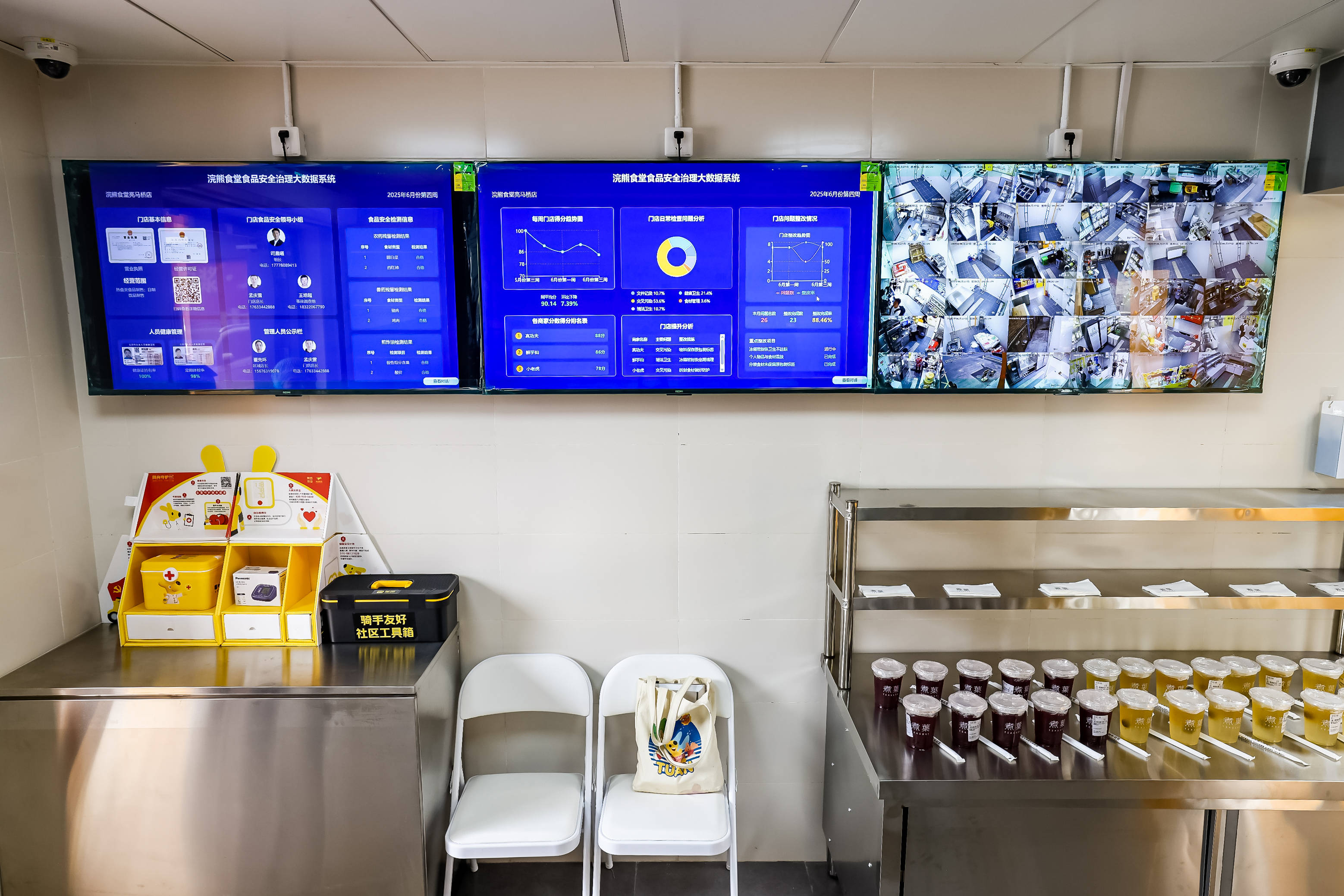 再次,全透明運(yùn)營。所有入駐商家統(tǒng)一配備直播系統(tǒng),營業(yè)時間后廚操作全程實(shí)時公開,消費(fèi)者可隨時觀看;也在浣熊食堂專題頁面上集中展示每日餐品加工、成品制作、巡檢記錄、進(jìn)貨清單等信息,將管理動作數(shù)據(jù)化、透明化。