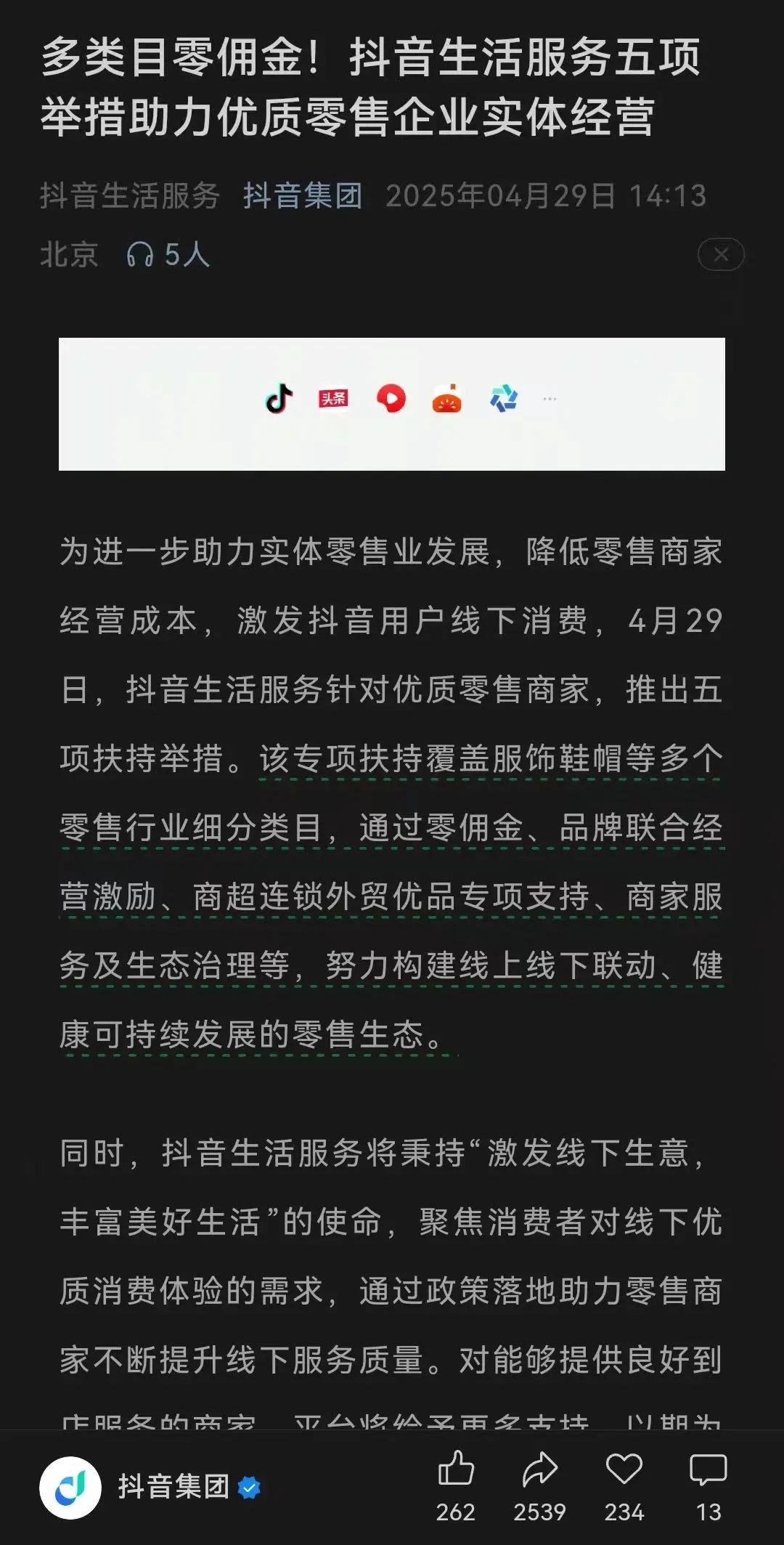 抖音對(duì)平臺(tái)傭金政策進(jìn)行有升有降的調(diào)整,希望借此留住優(yōu)質(zhì)商家,同時(shí)篩選出能持續(xù)為平臺(tái)賺錢的商家。例如,對(duì)新入駐的品牌直營(yíng)商家給予2025年零傭金政策,服飾鞋帽類商家在2025年6月30日前入駐可享零傭金等。