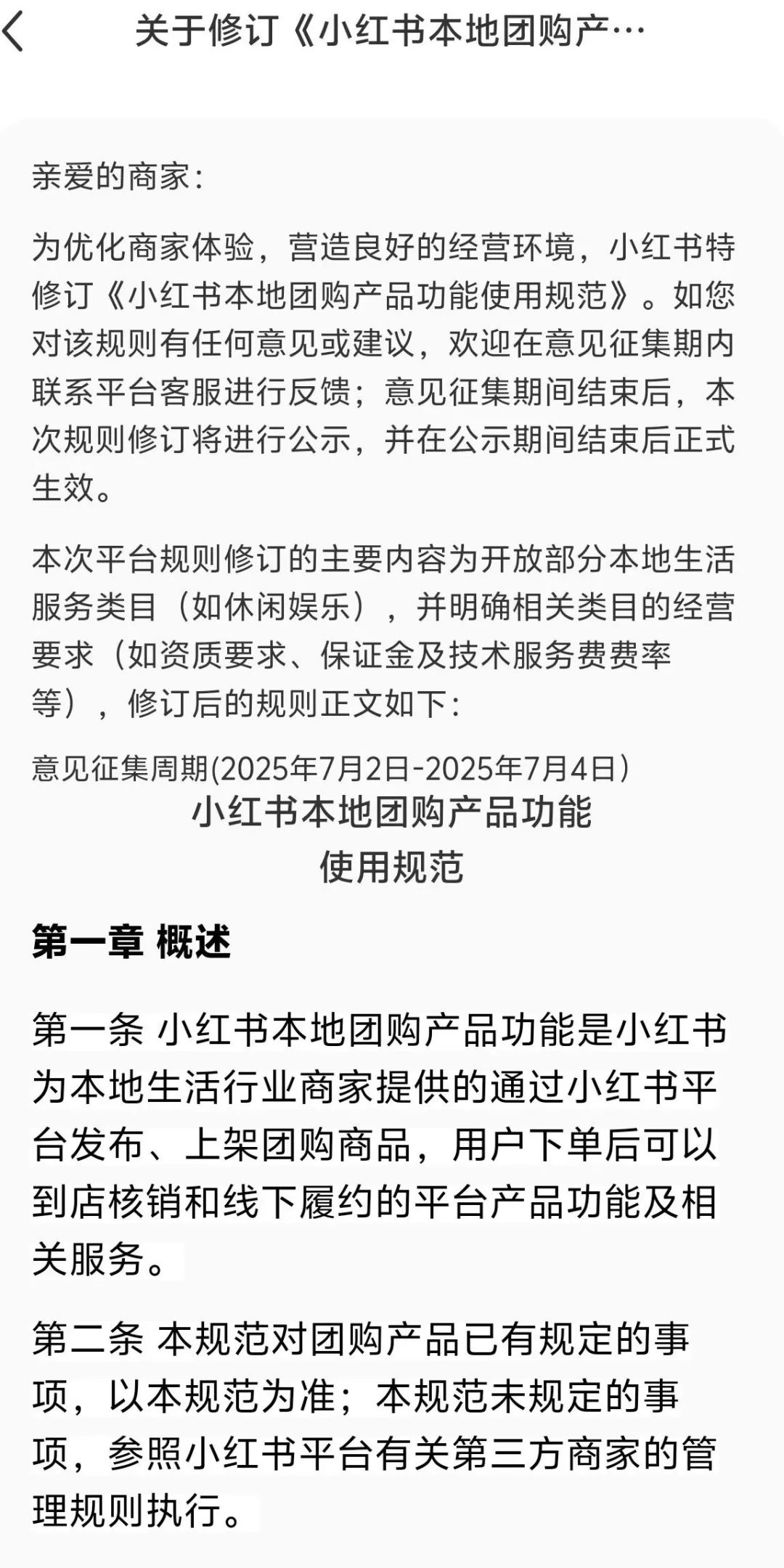 日前,小紅書發(fā)布了關(guān)于修訂《小紅書本地團(tuán)購(gòu)產(chǎn)品功能使用規(guī)范》的意見(jiàn)征集通知。