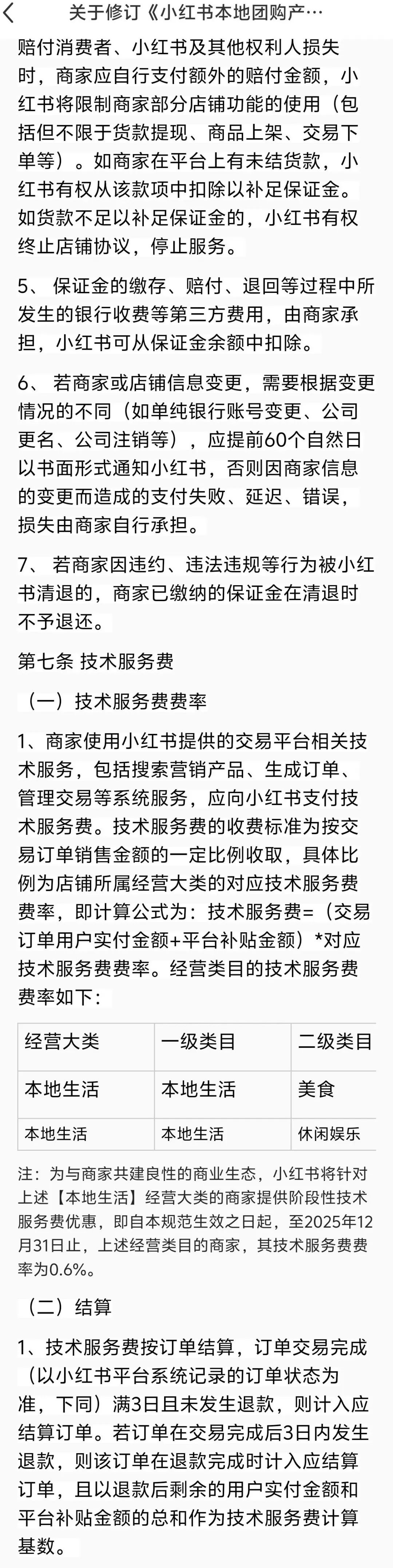 此外,公告還指出,針對(duì)美食和休閑娛樂(lè)類目的商家,平臺(tái)將長(zhǎng)期實(shí)行入駐保證金減免政策,且在2025年12月31日之前,技術(shù)服務(wù)費(fèi)率會(huì)由2.5%逐步下調(diào)至0.6%。