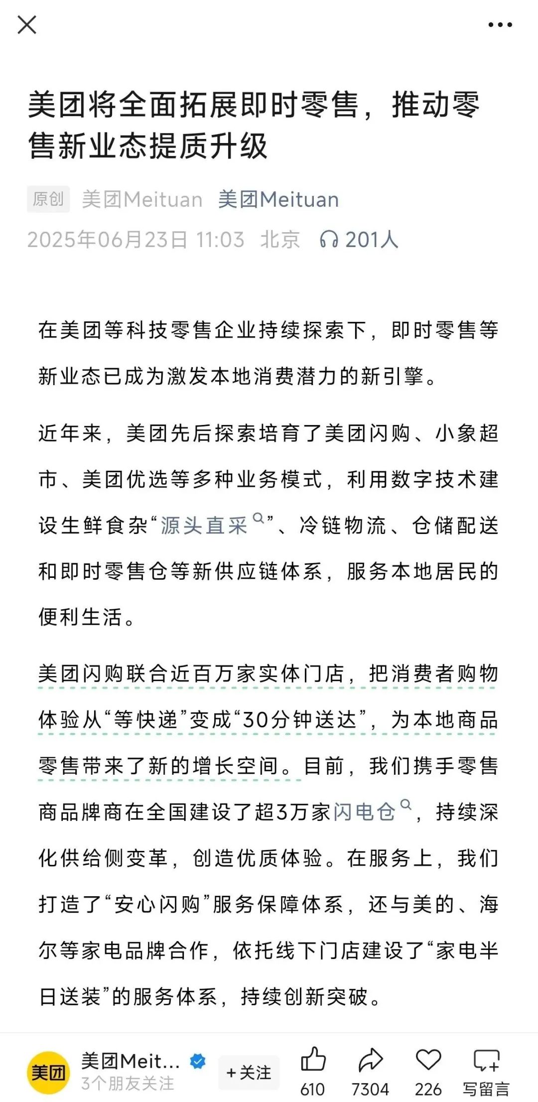 即便地位難以撼動(dòng),美團(tuán)也沒(méi)有躺在過(guò)往的成績(jī)上。6月23日,美團(tuán)官方發(fā)布公告,正式宣布將全面拓展即時(shí)零售,推動(dòng)零售新業(yè)態(tài)提質(zhì)升級(jí)。具體來(lái)看,美團(tuán)將針對(duì)旗下美團(tuán)閃購(gòu)、小象超市、美團(tuán)優(yōu)選等業(yè)務(wù)模式進(jìn)行調(diào)整升級(jí)。