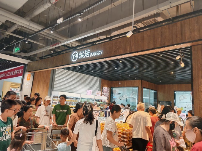 熟食類(lèi)專(zhuān)業(yè)廚師團(tuán)隊(duì)打造夏日限定熱鍋系列,推出小龍蝦、蒲燒鰻魚(yú),還引入撈汁海鮮及本地醬鹵特色——豆記熟食臘牛肉、醬牛肉,同時(shí)引入胖東來(lái)同款產(chǎn)品——九多肉多豬蹄、雙匯網(wǎng)紅甜腸,搭配雨潤(rùn)烤雞、周黑鴨鴨貨及現(xiàn)烤披薩、鏡糕等,覆蓋家庭餐桌與年輕客群休閑需求。烘焙區(qū)YHBakery系列成為焦點(diǎn),香蕉牛奶蛋糕、黃芝士馬斯卡彭蛋糕卷、菠菜核桃糯米面包、雙拼瑞士卷、菌菇多多等美味+高顏值產(chǎn)品直擊消費(fèi)者心智。