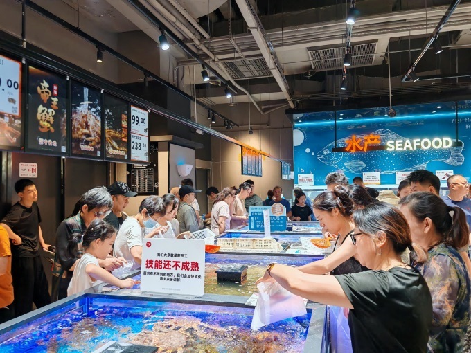 服務(wù)細(xì)節(jié)盡顯巧思,顧客休息區(qū)增設(shè)身高測(cè)量?jī)x、血壓計(jì)、洗手池、直飲水及微波爐,寵物安置區(qū)配備飲水裝置;肉禽柜臺(tái)提供切絲、切片、絞肉等定制化處理,海鮮區(qū)承諾“只賣(mài)海鮮不賣(mài)水”,并支持清洗、打氧、刨魚(yú)等全流程服務(wù);細(xì)節(jié)優(yōu)化,貨架旁放置放大鏡,連卷袋旁配濕手器,果切按甜度排序標(biāo)注食用順序,毛巾區(qū)放置隔離袋避免串味。