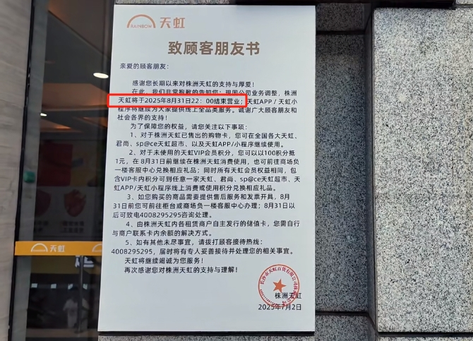 聯(lián)商快訊:近日,天虹商場旗下兩家門店分別官宣閉店。7月2日,惠州君尚百貨通過官方渠道發(fā)布結(jié)業(yè)聲明,明確因“公司業(yè)務(wù)調(diào)整”,門店將于2025年8月25日21:30正式停業(yè),即日起至閉店前正常運營并逐步推進善后工作。
