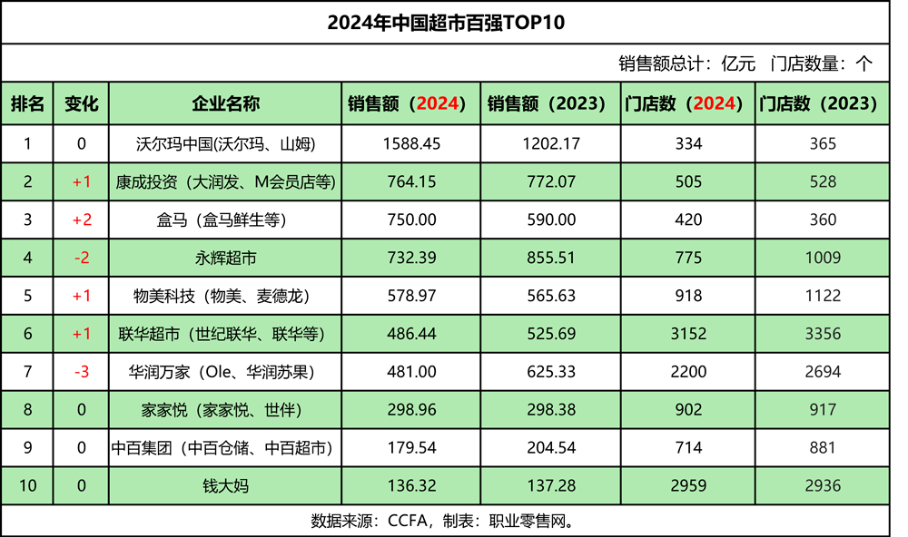 根據(jù)中國連鎖經(jīng)營協(xié)會(huì)(CCFA)剛剛發(fā)布的《2024年中國超市TOP100》榜單,盒馬以750億元銷售額、420家門店的成績,首次躋身全國前三。