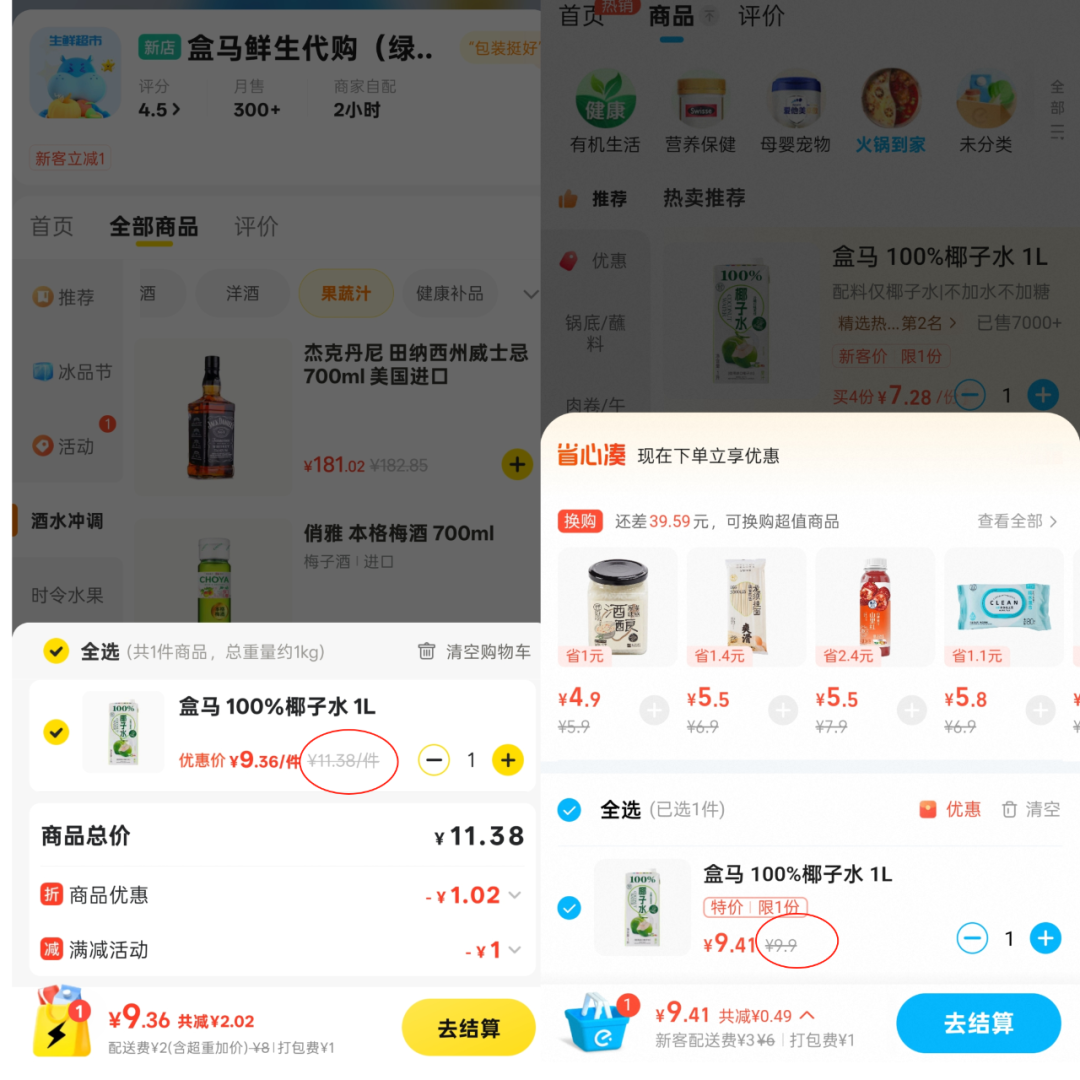 以盒馬1L規(guī)格的100%椰子水為例,優(yōu)惠前的實(shí)際價(jià)格,美團(tuán)是11.38元,餓了么是9.9元,美團(tuán)代購店鋪實(shí)際價(jià)格上浮了15%。但是在實(shí)際下單時(shí),疊加各種平臺(tái)活動(dòng)和優(yōu)惠券,實(shí)際付款價(jià)格為9.36元,低于餓了么平臺(tái)的9.41元。