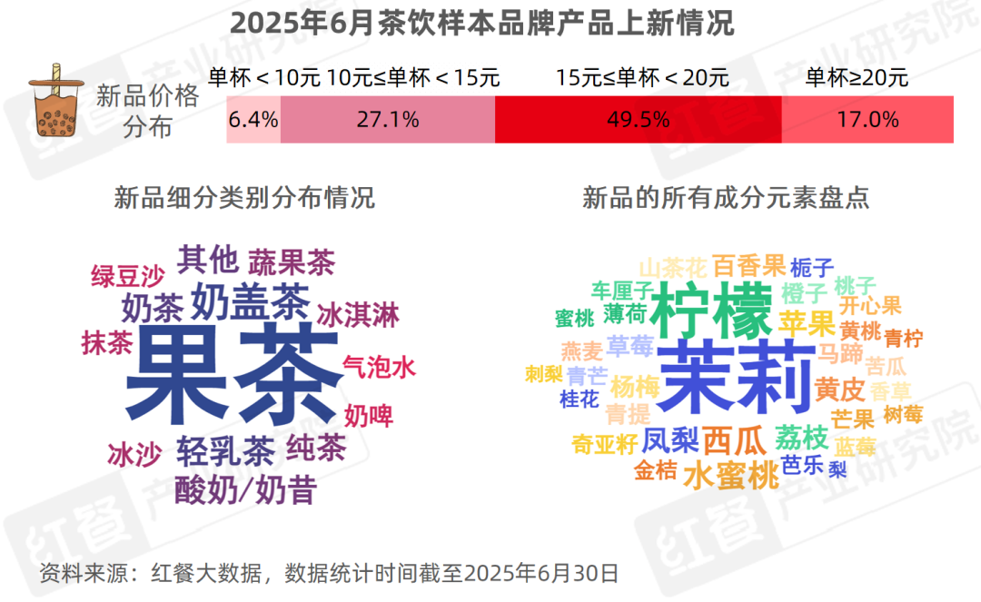 2025年6月,紅餐產(chǎn)業(yè)研究院監(jiān)測到有64個茶飲品牌推出了245款新品,其中茶飲類和咖啡類新品一共有223款,烘焙類和甜品類新品總計13款。