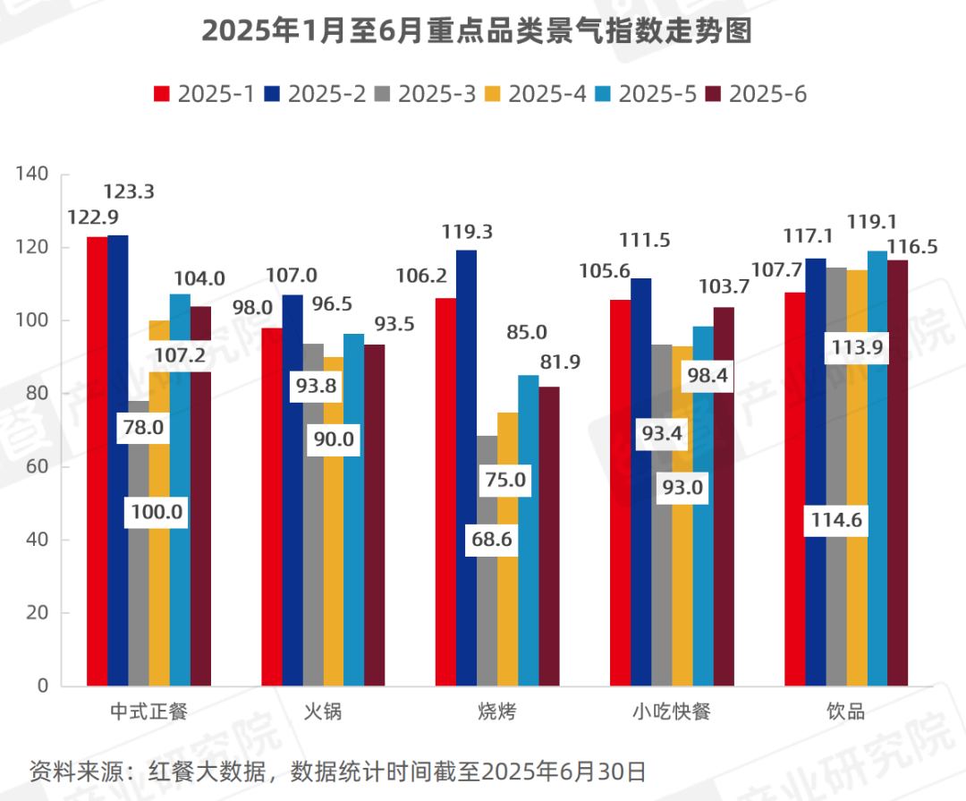 2025年6月,中式正餐、火鍋、燒烤、小吃快餐、飲品五大餐飲賽道景氣指數(shù)的表現(xiàn)各不相同。