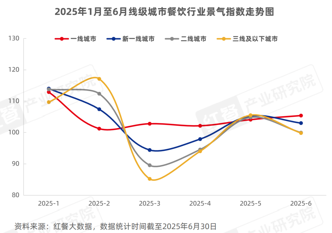 2025年6月,一線城市、新一線城市、二線城市、三線及以下城市的餐飲行業(yè)景氣指數(shù)呈現(xiàn)不同的變化趨勢。
