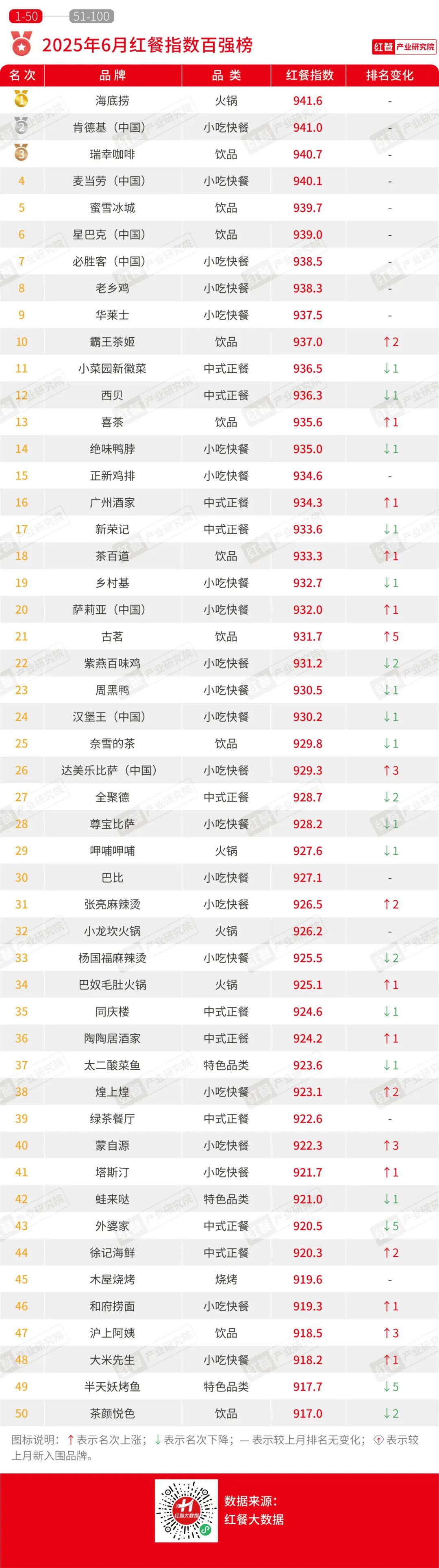 2025年6月,在“紅餐指數(shù)百強榜”中,品牌名次上升的有36個,名次下降的有33個,名次不變的有30個,新上榜品牌1個。排在榜單前三名的分別是海底撈、肯德基(中國)以及瑞幸咖啡,麥當勞(中國)、蜜雪冰城、星巴克(中國)、必勝客(中國)等緊隨其后。