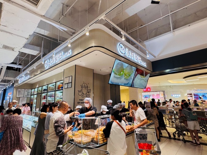 生鮮區(qū)匯集全球及本土優(yōu)質(zhì)食材,從云嶺有機蔬菜、新疆吊干杏、龍泉驛水蜜桃,到潮汕牛肉、澳洲和牛、遼寧生蠔、帝王蟹等,確保新鮮直達。烘焙熟食區(qū)作為核心亮點,其占比從調(diào)改前的9%大幅躍升至26%,明星產(chǎn)品“榴蓮千層”嚴選馬來西亞樹熟貓山王榴蓮,果肉含量超40%;“豐收的喜悅”、“核桃滿滿”等深受歡迎,全線產(chǎn)品禁用脫氫乙酸鈉、代可可脂等添加劑;熟食區(qū)則主打東北特色,現(xiàn)場制作鍋包肉、鹵豬蹄等經(jīng)典美味。