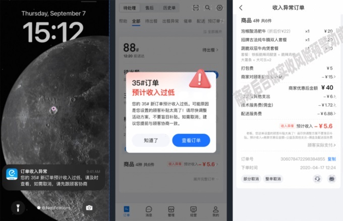 例如,當(dāng)餐飲商家在創(chuàng)建活動時,餓了么商家版后臺會實時幫商家預(yù)估實收,提醒活動補貼過高可能會虧損,建議商家及時進行活動修改。當(dāng)接收到的單筆訂單屬于零負實收時,餓了么商家版后臺會實時通過手機Push、客戶端內(nèi)的彈窗等方式為商家發(fā)出預(yù)警。同時,餓了么商家版后臺會對近7天存在零負實收訂單的情況進行風(fēng)險預(yù)警和歸因,并建議商家盡快調(diào)整營銷活動,關(guān)注實收和利潤率。