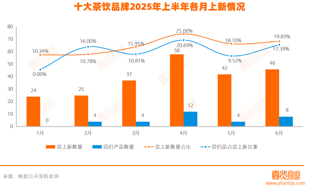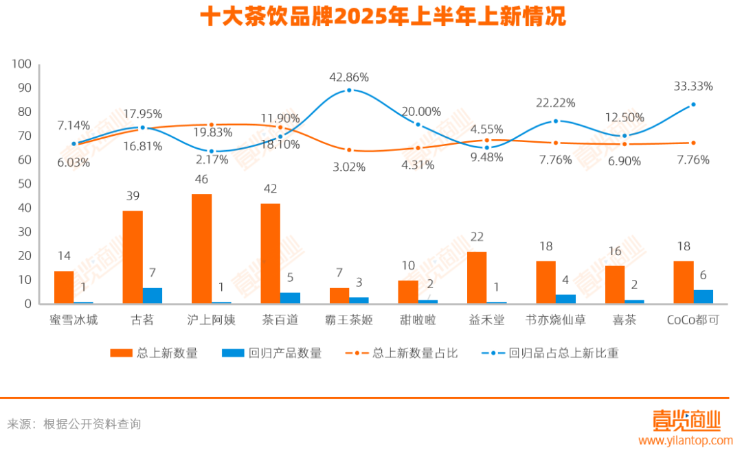據茶咖觀察統(tǒng)計,今年上半年,全國門店數量TOP10的茶飲品牌共推出了232款新品,平均每天上新1.3款產品,其中包含32款回歸品和200款真正意義上的新品。