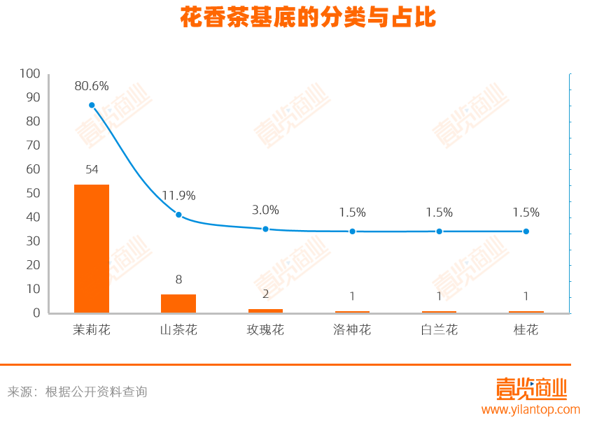 從具體產品來看,茉莉花茶廣泛應用——有54款產品都選用了茉莉花茶作為基底。它是較為常用的茶基底,如蜜雪冰城、古茗、滬上阿姨、茶百道等多個品牌都有以茉莉花茶為基底的新品,因其香氣清新,能很好地與各種水果、奶基底搭配。