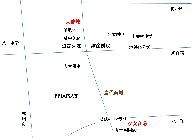 依照目前區(qū)域內(nèi)各個商場的分布,南部三環(huán)交叉路口附近有雙安商場、華宇時尚SC,北部接近四環(huán)位置就是大融城,鄰近位置有領(lǐng)展SC、新中關(guān)SC,近幾年來人氣、商氣比較活躍的是華宇時尚SC、領(lǐng)展SC、新中關(guān)SC,運營狀況處于穩(wěn)定、成長中。