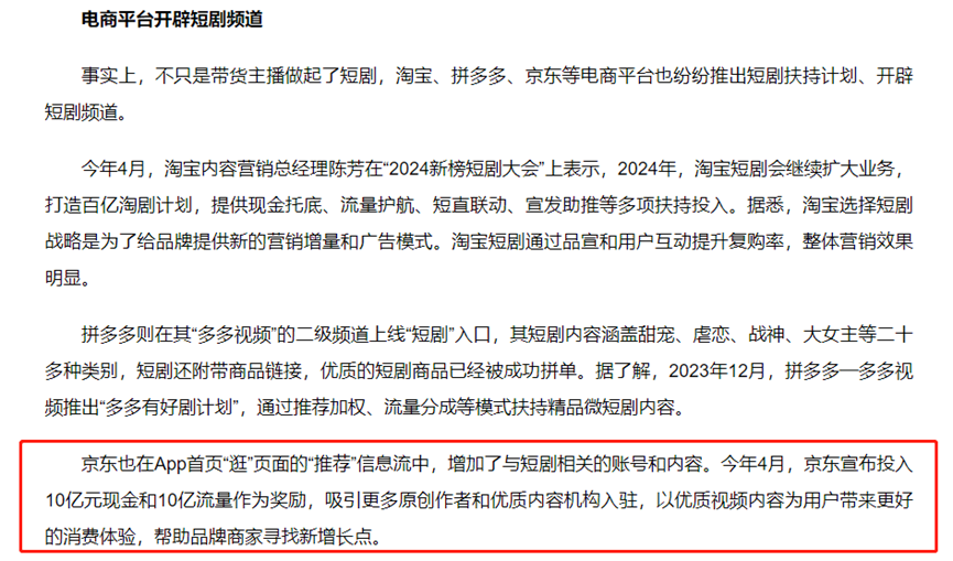 去年上半年,京東在京東App首頁(yè)“逛”頁(yè)面的推薦信息流中增加短劇內(nèi)容,并宣布投入10億元現(xiàn)金和10億流量,來吸引大量?jī)?yōu)質(zhì)原創(chuàng)作者和機(jī)構(gòu)入駐,為京東用戶提供高質(zhì)量的短劇。