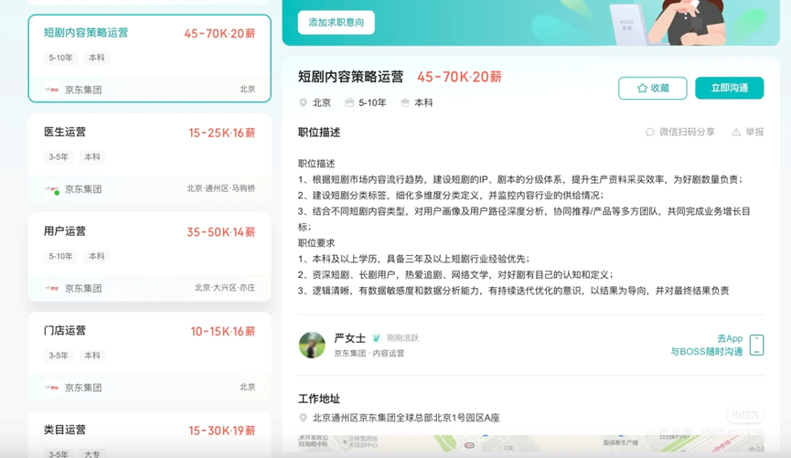 近日,有網(wǎng)友發(fā)現(xiàn),京東突然開始招聘多個(gè)與短劇相關(guān)的崗位,包括內(nèi)容策略運(yùn)營(yíng)、內(nèi)容運(yùn)營(yíng)等。從招聘網(wǎng)站顯示的信息來看,京東為了吸引行業(yè)頂尖人才,給短劇內(nèi)容策略運(yùn)營(yíng)崗位開出了45k-70k、20薪的工資,算下來年薪高達(dá)140萬。