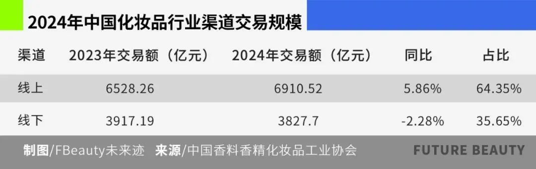 中國香妝協(xié)會發(fā)布的數(shù)據(jù)顯示:2024年中國化妝品市場交易總額為10738.22億元,同比增長2.8%。其中線上交易規(guī)模增長至64.35%;而線下則出現(xiàn)小幅收縮,同比下滑2.28%至3827.7億元,占比為35.65%。
