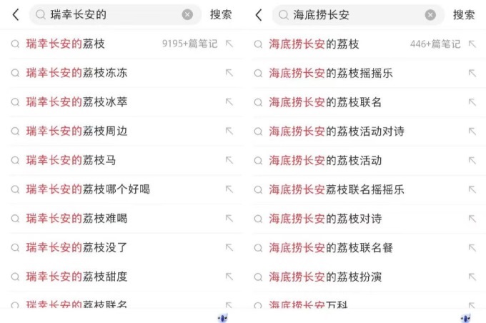 筆者又統(tǒng)計了下小紅書UGC內(nèi)容的互動聲量,以下列案例為例在小紅書搜#海底撈長安的荔枝顯示的筆記有446篇,搜#瑞幸長安的荔枝顯示筆記有9195篇,瑞幸的話題傳播度是海底撈的20倍。