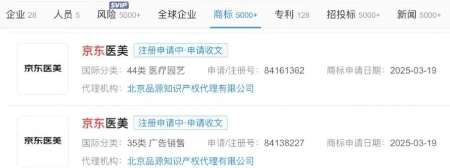 2025年3月,京東健康設(shè)立子公司北京京東醫(yī)療美容診所有限公司,并申請了“京東醫(yī)美”商標(biāo)。