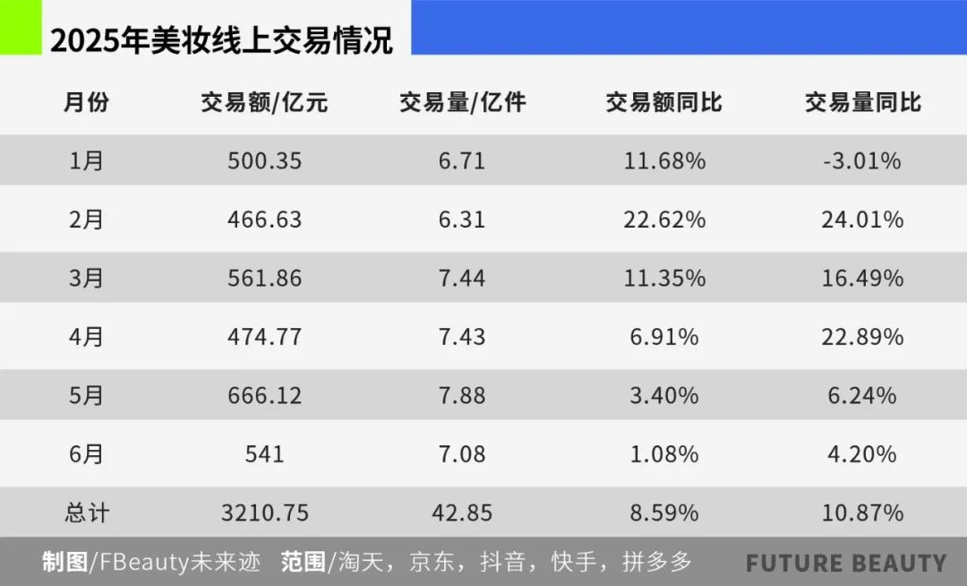 《FBeauty未來跡》整合五大電商平臺數(shù)據(jù)發(fā)現(xiàn),上半年線上美妝交易額突破三千億,同比增長8.6%,交易量增長超10%,展現(xiàn)出強大的韌性。