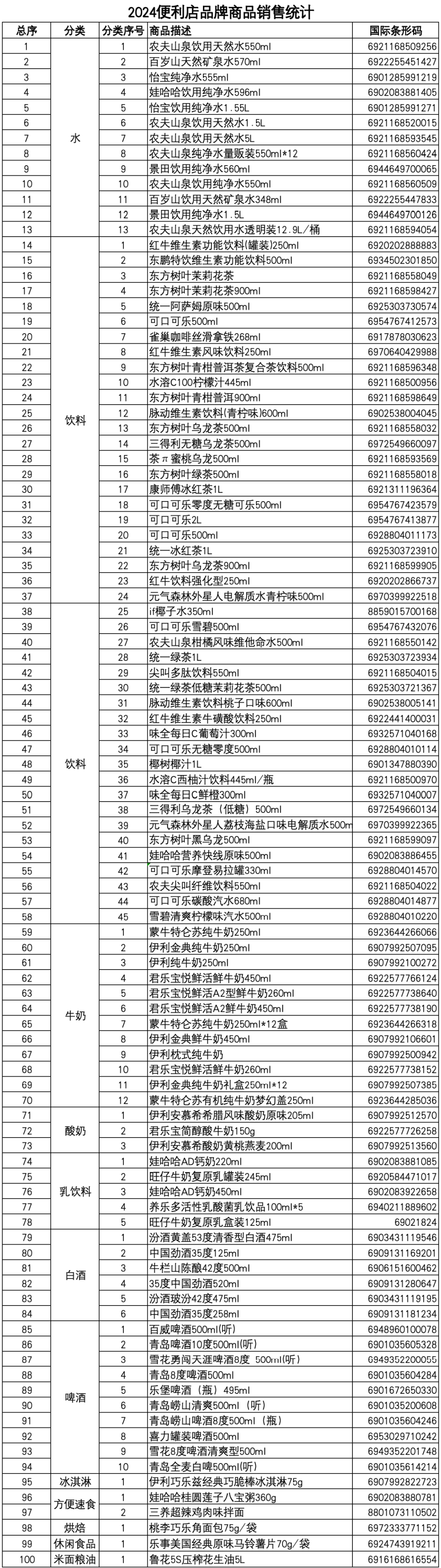 此統(tǒng)計基于樣本企業(yè)銷售額前100名商品(不包含香煙)。所有單品按匯總銷售額由高到低排列,覆蓋7個(2023年覆蓋6個)及以上樣本企業(yè),銷售額最高的前100個單品即進入暢銷品名單。